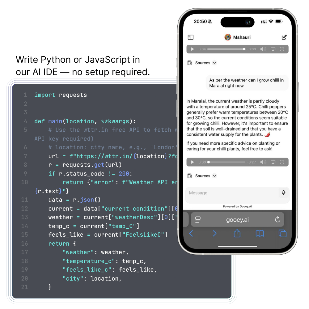 Use Gooey.AI's APIs to build fast! Get started by trying these simple setups - **No servers, API keys, or rate limits to manage.**